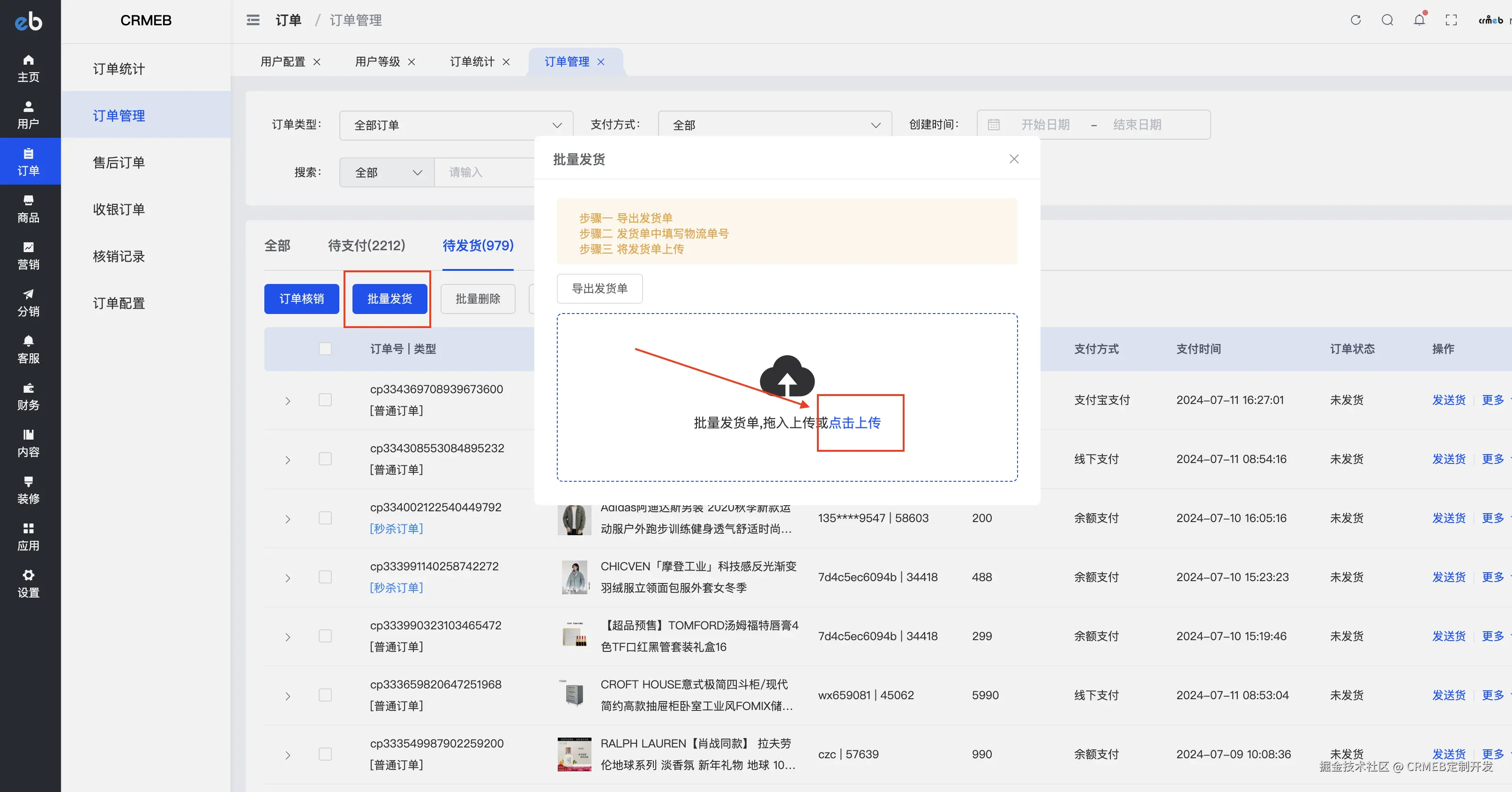 将填写完成的excel发货单点击“点击上传”导入;系统将对发货单中的订单批量执行发货操作