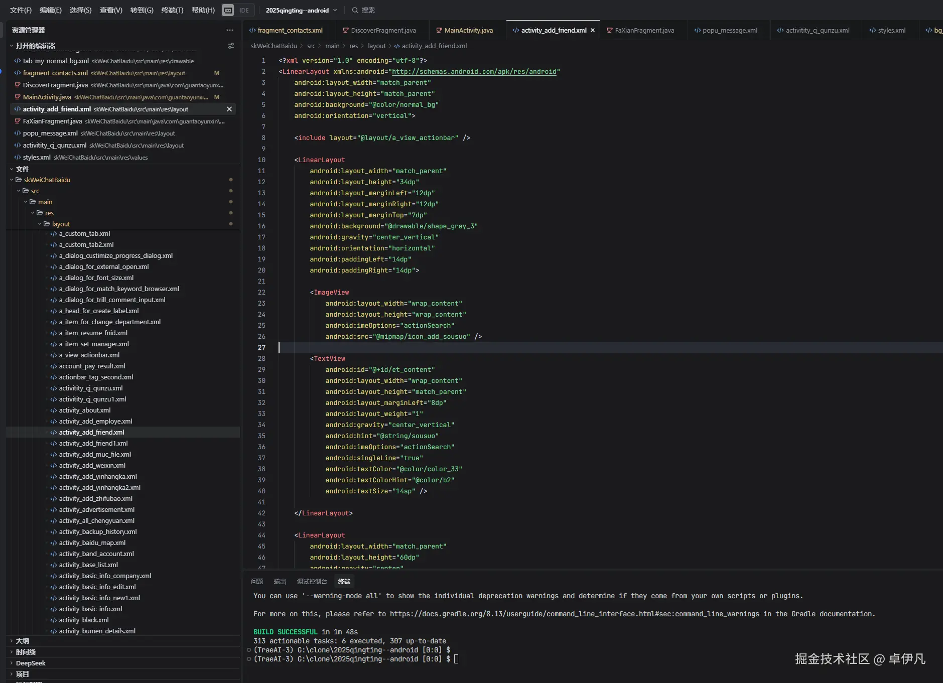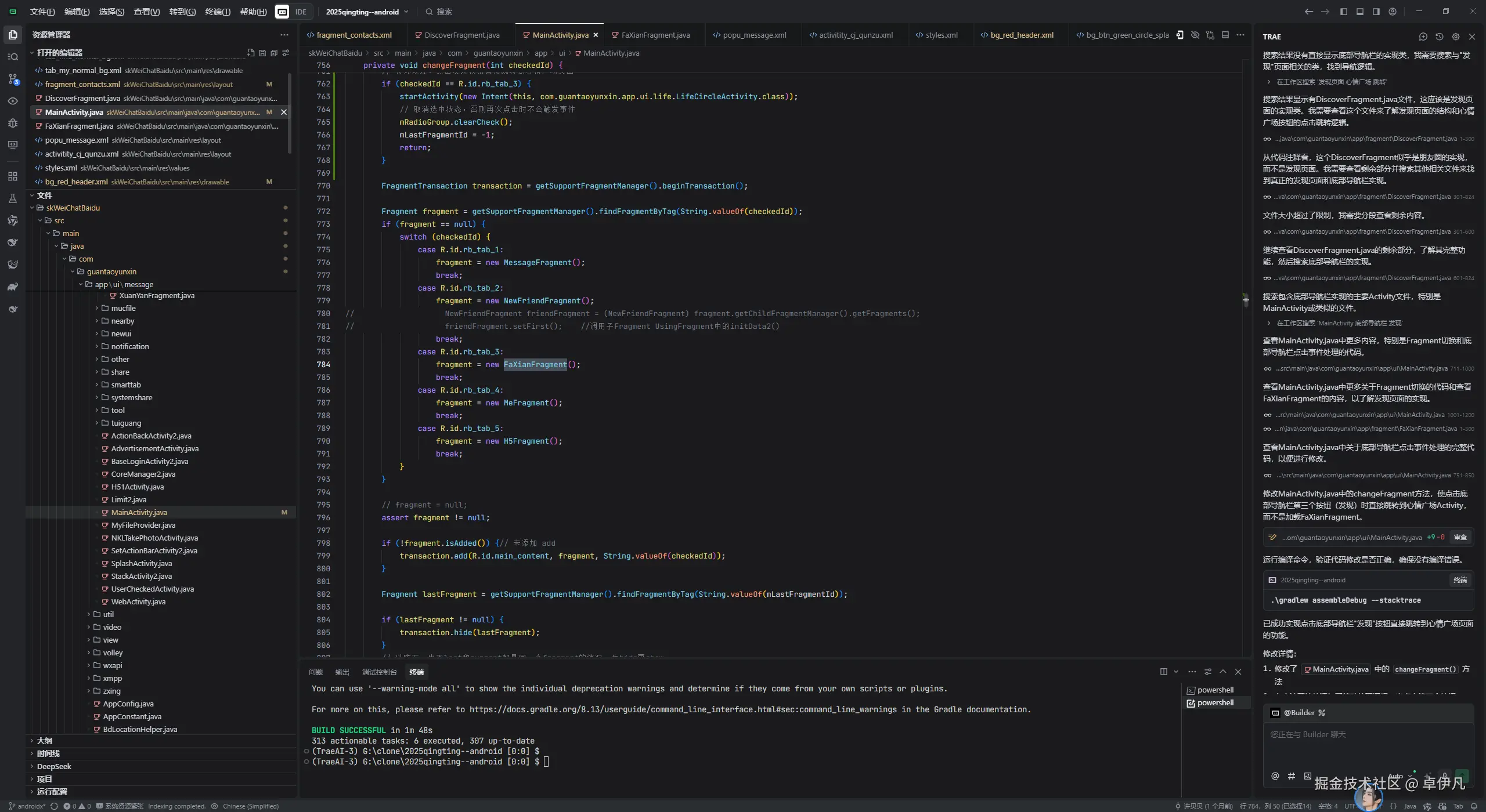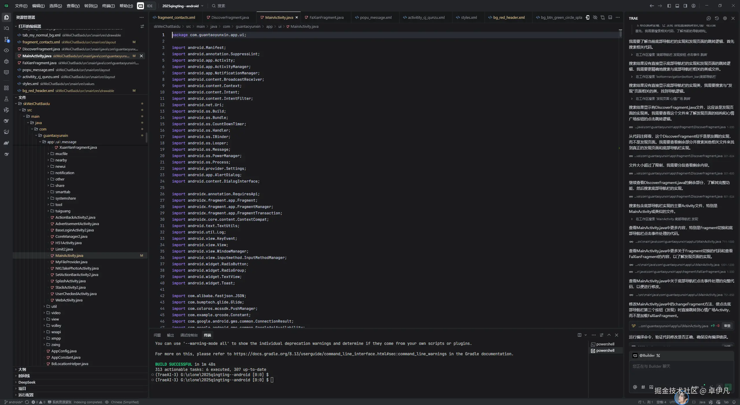 本次二开布局没有变,但是下一次整体布局会有变,不过本次开发发现朋友圈跳转功能的流程步骤也做了一定的变化。原生项目复杂就复杂于就算一个颜色的改动可能都比较麻烦,不像普通web项目或者vue项目,其次原生项目安卓Android的环境配置是很复杂的,很多人 第一步可以搞一周 甚至一个月都搞不成功,再次之前说了可以用trae辅助我们编程,但是真正的开发和调试还是得Android studio 离开Android studio 原生安卓项目也是没法运行的,至少trae满足不了,vs要满足也比较麻烦,本篇改颜色和主页图标,本项目代码 毫不夸张的说 就是WhatsApp的初期代码,历史大概有15年了。