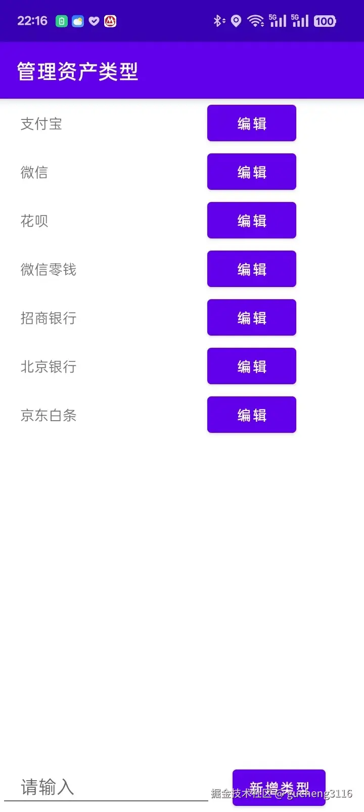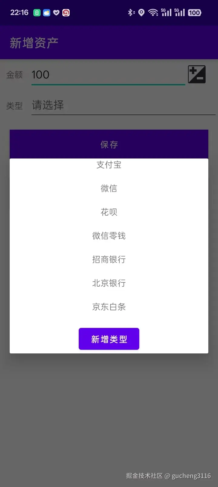 新增资产页面可以添加新的资产项目,以及选择资产类型,资产类型如果没有,可以手动添加。