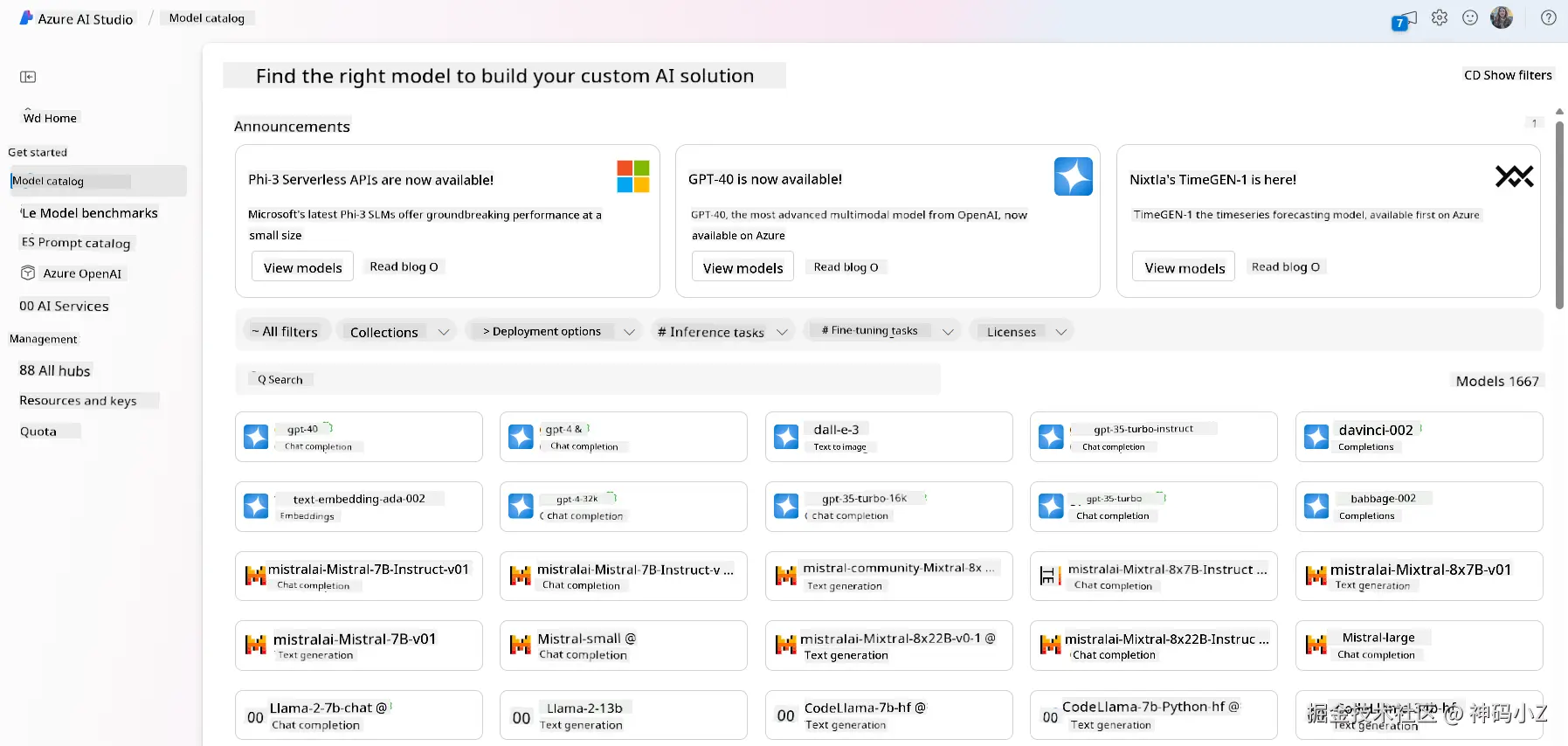 - 在目录中找到感兴趣的基础模型——无论是专有还是开源模型,可以通过任务、许可证或名称筛选。为了提升搜索效率,模型被组织成多个集合,如Azure OpenAI集合、Hugging Face集合等。