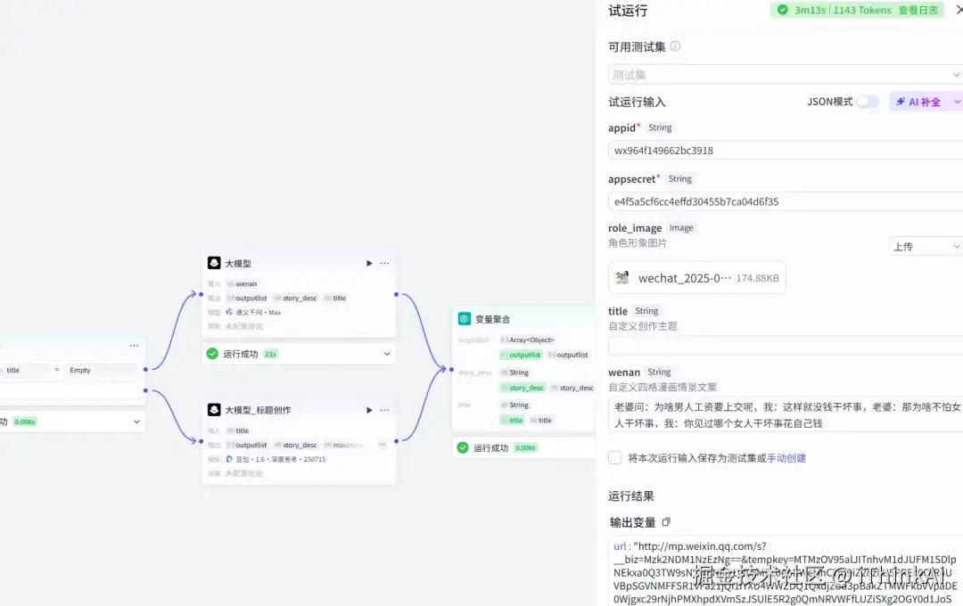 1.通过输入节点获取创作主题或参考文案2.豆包大模型生成包含分镜/对话的完整脚本3.即梦生图节点批量生成4张漫画配图4.代码节点自动排版并保存至公众号草稿