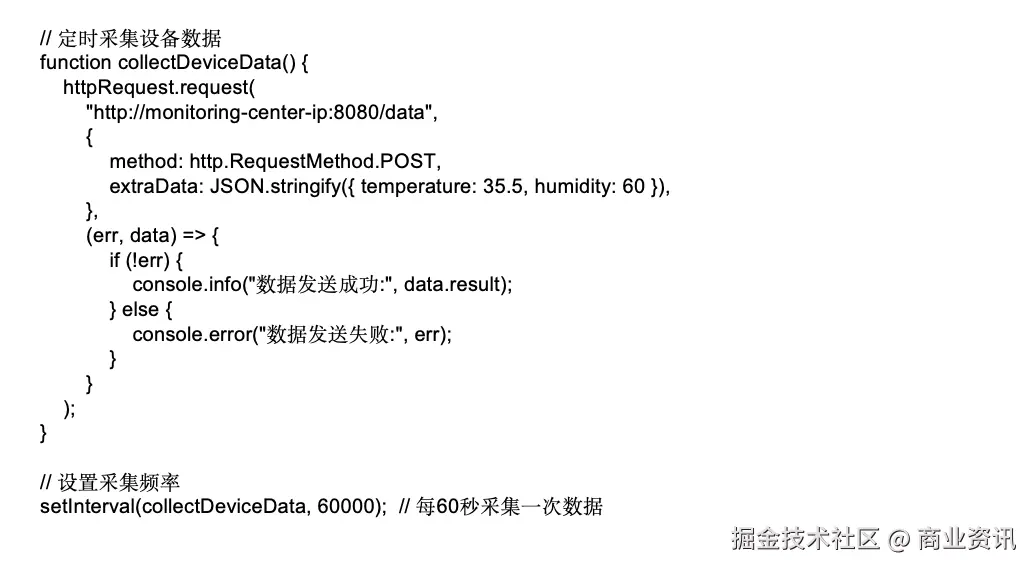 此代码展示了如何在设备端定时采集并发送数据。通过这种方式,监控中心能够实时接收到各设备的数据,从而在出现异常时及时响应。