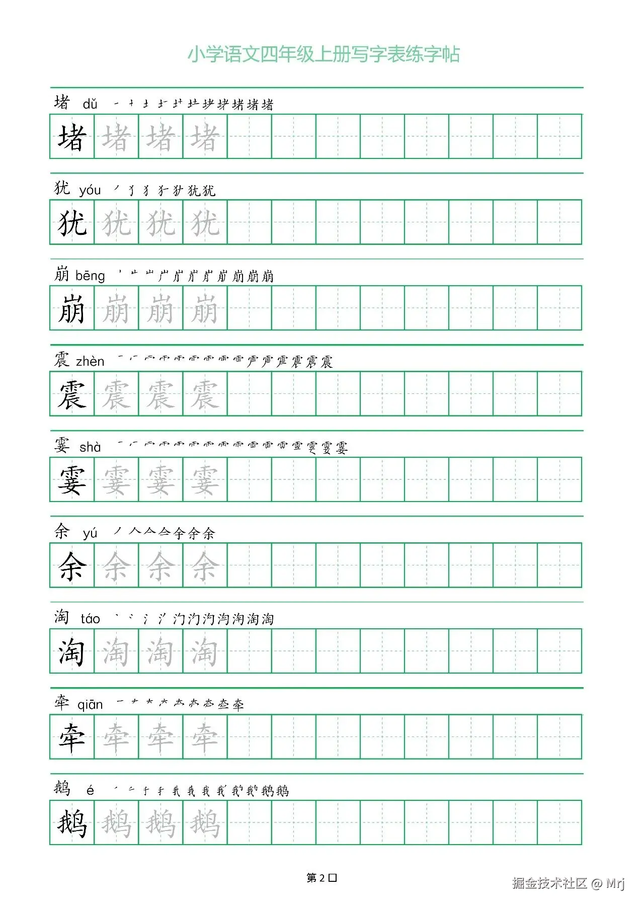 【统编版四年级语文上册同步描红字帖】精选教材生字,每字提供3次描红格+1个临写空格,包含"潮、据、堤"等重点字。采用1.5cm田字格,蓝色浅印字体规范笔顺,保护视力米黄纸张。每日一课配套练习,帮助掌握字形结构,提升书写工整度。附免费PDF下载链接,支持A4纸打印