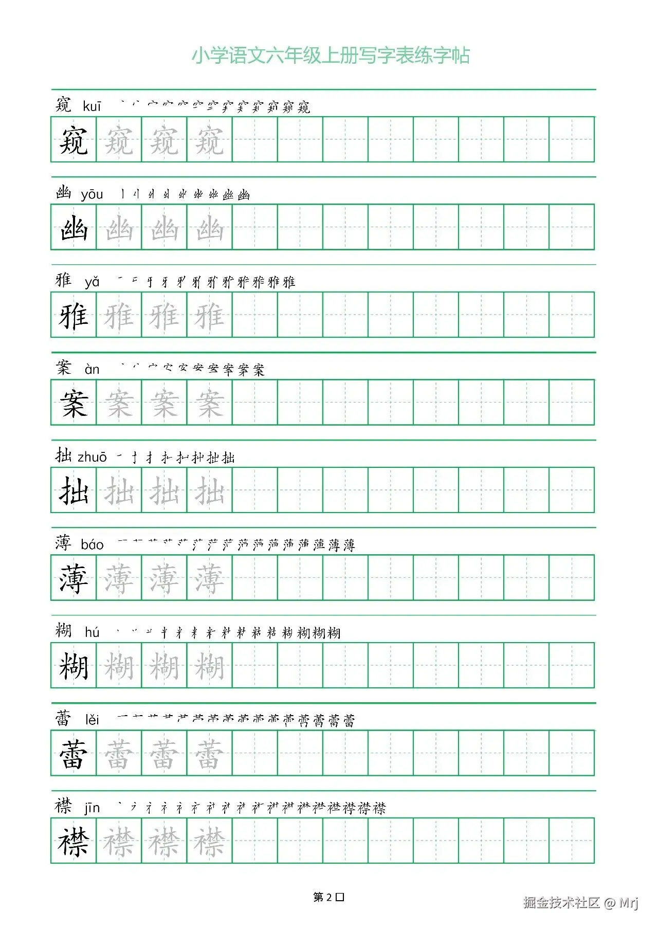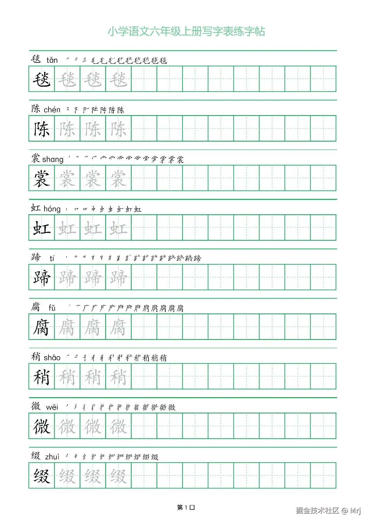 六年级语文上册一字三描红写字表字帖