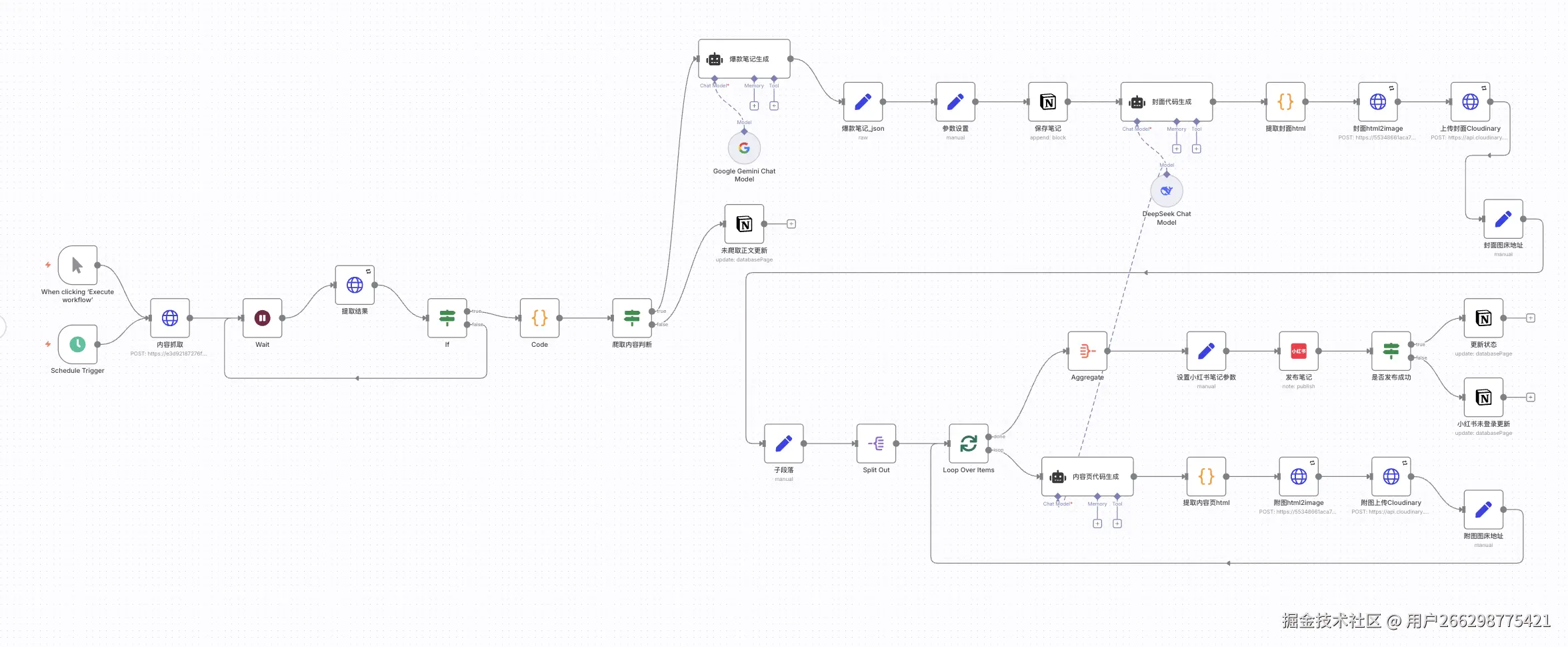 带着这个思考,我深入研究了小红书的n8n自动化系统,发现自动化的核心难点主要集中在内容抓取和自动发布两个环节。而内容的图文创作,现在的AI已经能够很好地胜任。