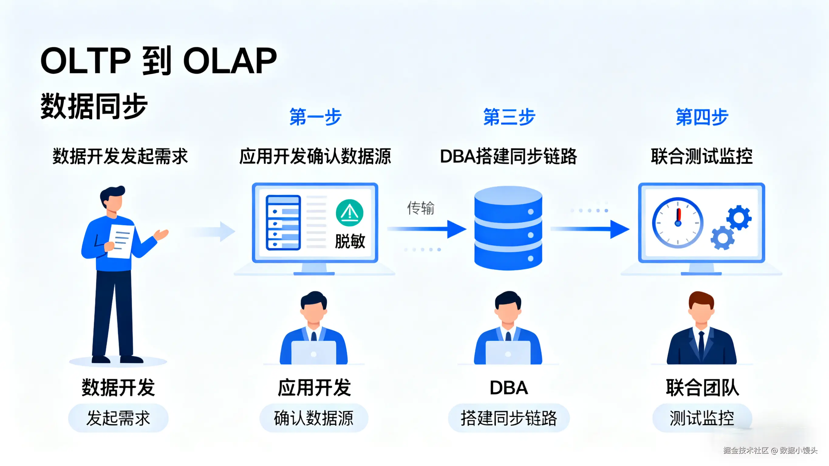 这一流程是企业日常运营中最频繁的跨团队协作场景。数据开发团队根据分析需求提出数据抽取需求,应用开发团队确认数据源表和敏感数据的处理规则,DBA搭建同步链路,并负责权限配置和数据同步监控。
