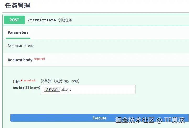 因为fastapi集成了Swagger,我们也定义了接口文档地址FastAPI(..., docs_url='/docs)。所以可以直接访问 http://0.0.0.0:8001/docs 通过页面创建任务。