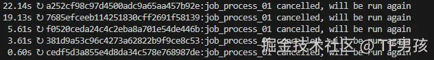 这时候我重启服务,模拟异常中断。结果它标记被打断,以后会继续运行。
