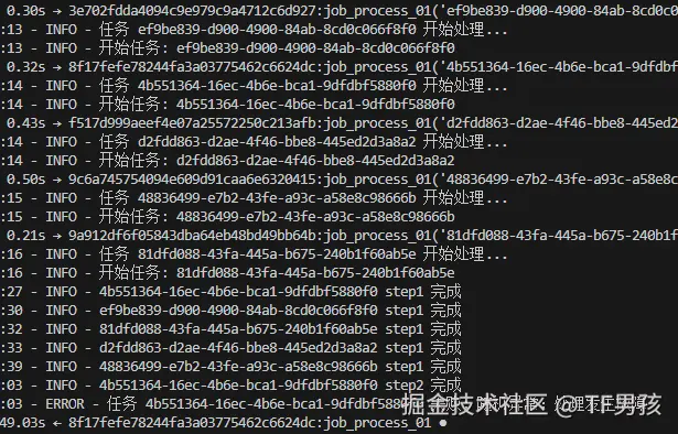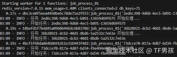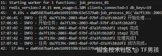 这样就建好了arq程序。只要我们调用arq worker.WorkerSettings就可以启动这个独立的进程。它会监听redis队列,一旦有新任务入队,他就拉过来执行。