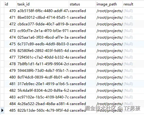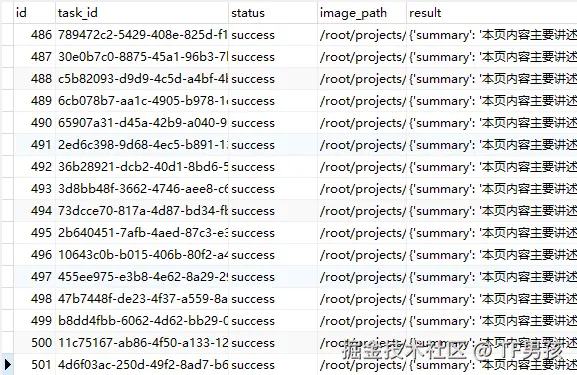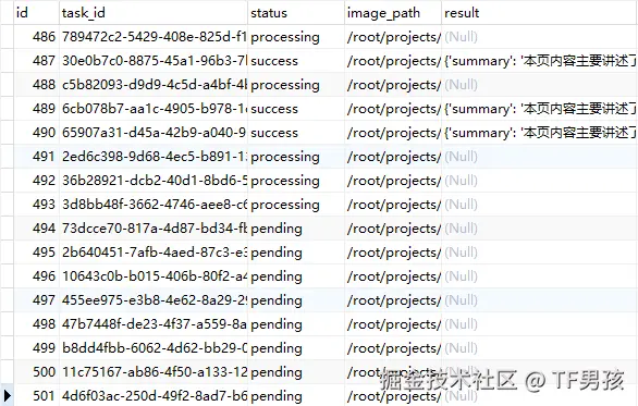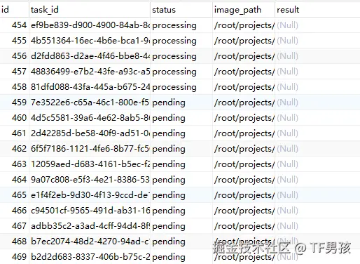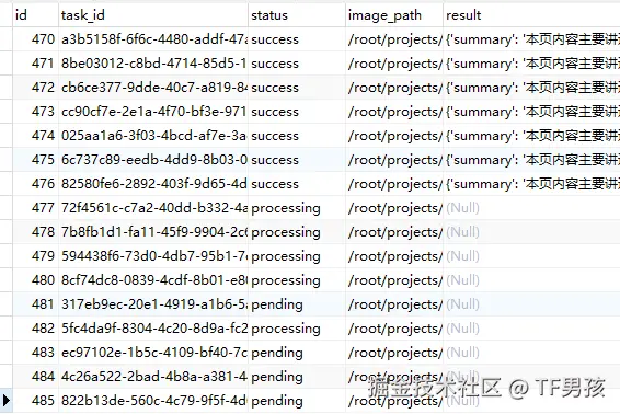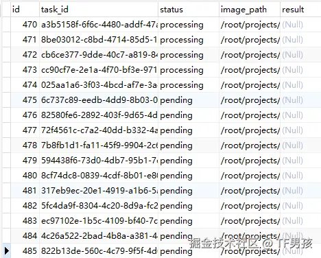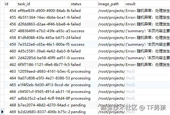 - 数据库 (MySQL):用一张表来存储所有任务的状态、结果等信息。这是我们实现状态查询、任务管理的核心。