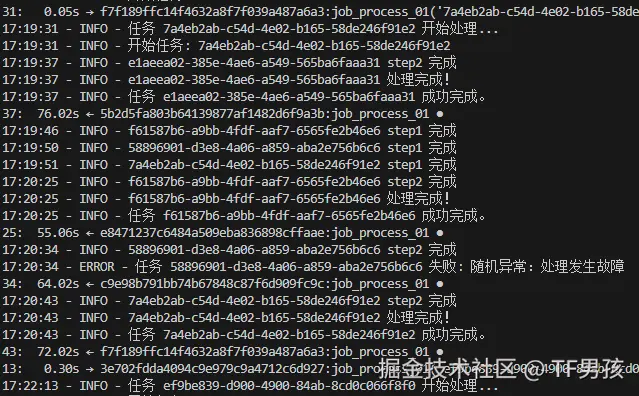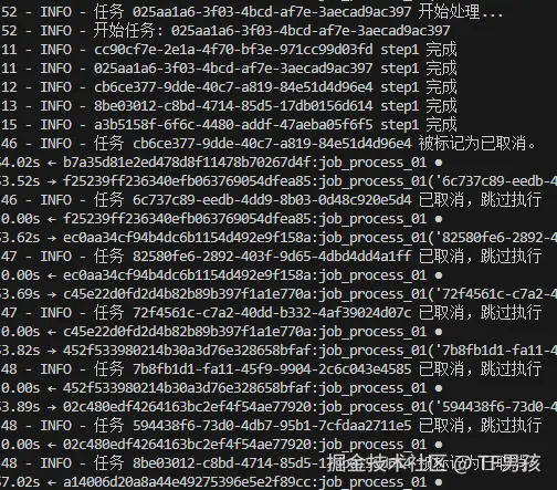 这里面可能会调用图像识别模型、NLP模型,整个过程可能好几步。我们假定分2步,第一步大约10到30秒,第二步大约30到60秒。每一步的前后,都要做一个检测,看一下任务是否被取消了。如果取消了,厨师傅要收尾刷锅。这叫“协作式取消”(对应地还有“强制中断”,杀进程,直接把锅扔了)。最后,我们还模拟了成功和失败。在实践中也是,并非每个任务都能完美成功,各种各样的问题会导致异常。
