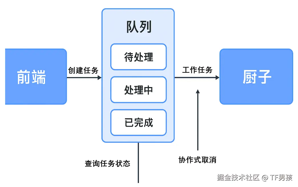 - 任务状态管理:每个任务都需要记录状态:排队中、处理中、已完成、已取消、处理失败等。状态随时可查询,服务员前端接口可用来告诉顾客“您的订单排第几、预计多久完成”。