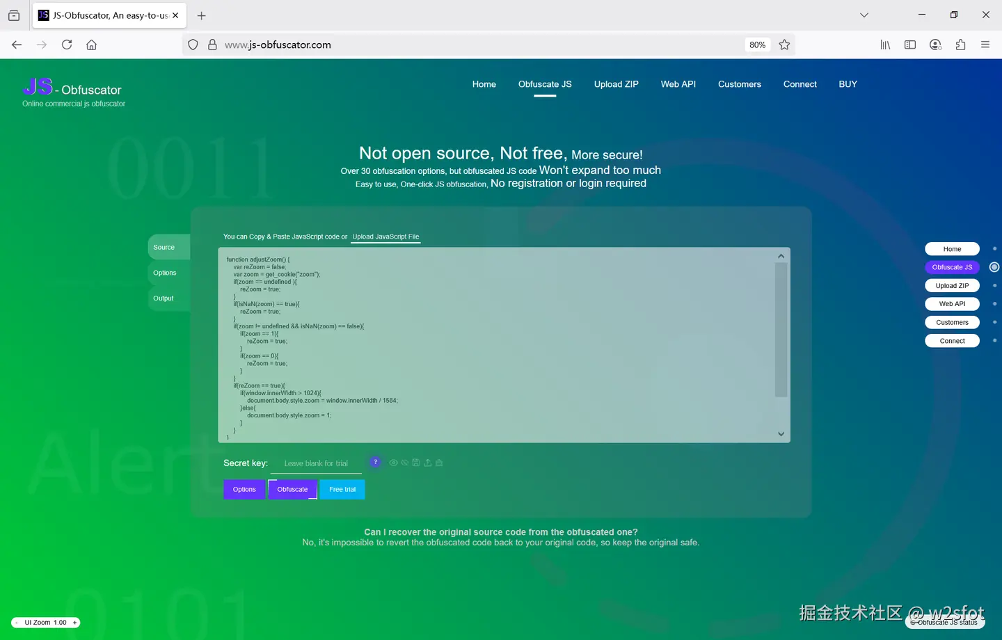 如果不想他人知道自己是如何实现这个功能的,可以将JS代码加密,比如用JShaman、JS-Obfuscator等提供的JS代码混淆加密服务: