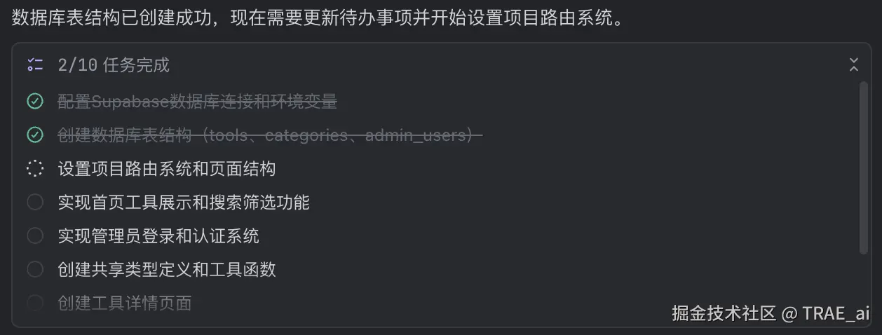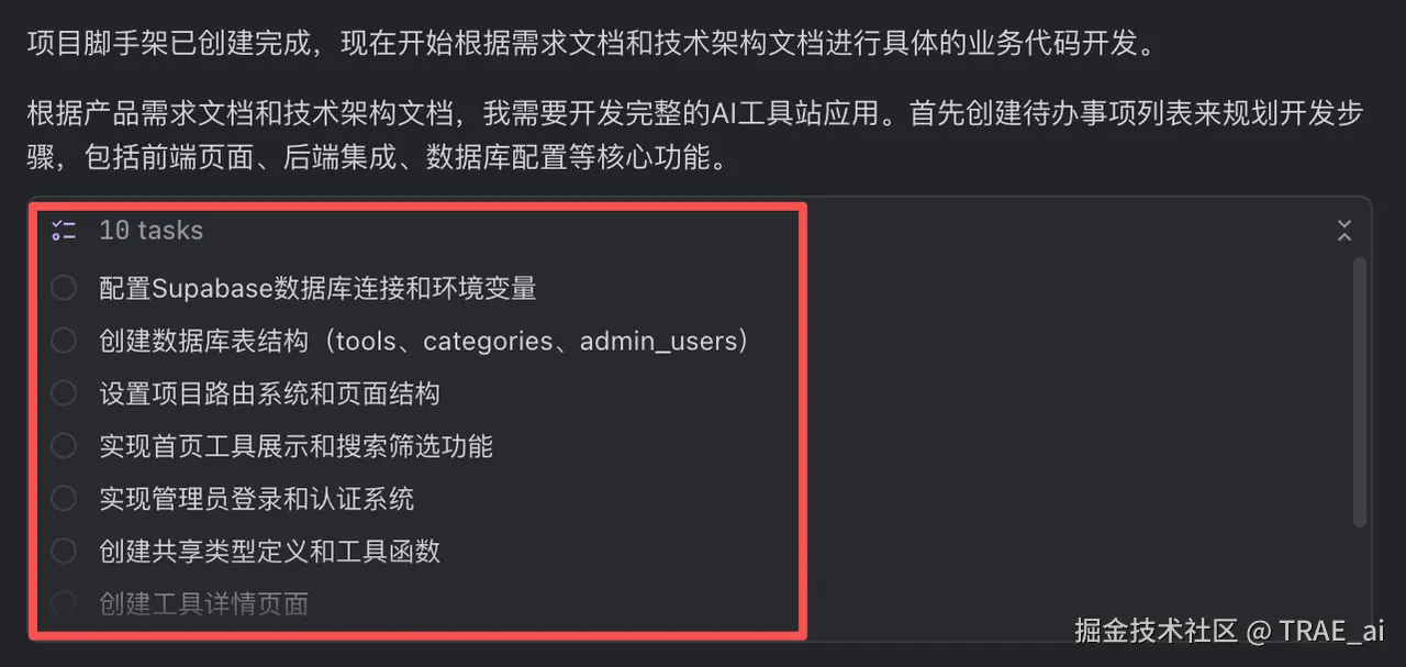 TRAE SOLO 会根据待办事项列表来逐步完成开发步骤。