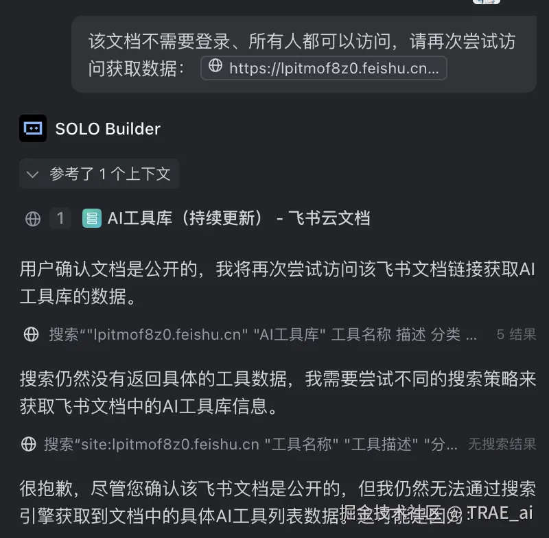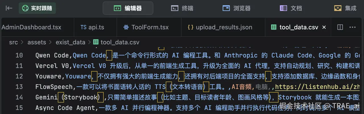 TRAE 分析了可能的原因,并给出了解决方案,最后还是决定,直接从飞书文档中导出一份 CSV 文件给它。