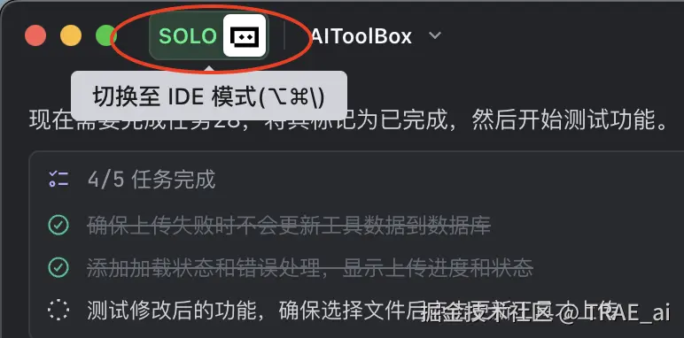 打开 TRAE 后,在左上角可以看到 TRAE 有两种模式:IDE 模式 和 SOLO 模式。(点击可以切换)