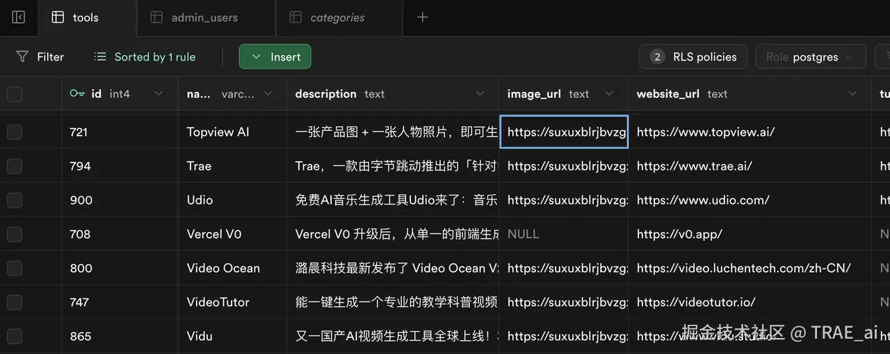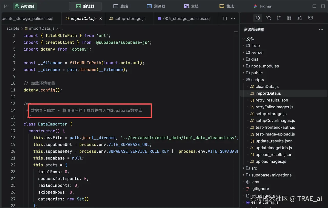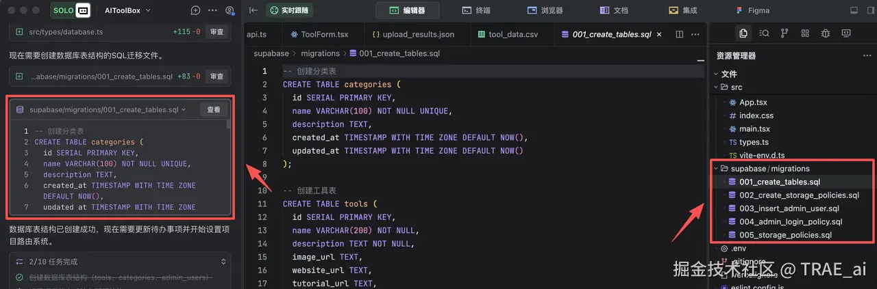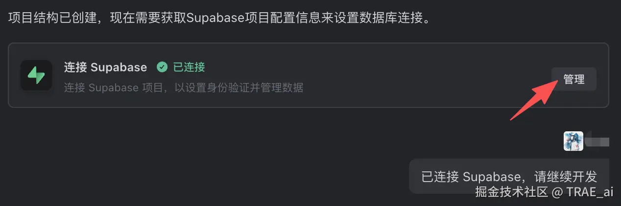 TRAE SOLO 直接将 Supabase 服务集成了进来,不需要我们了解太多数据库和后端技术了,大大简化了上手难度。