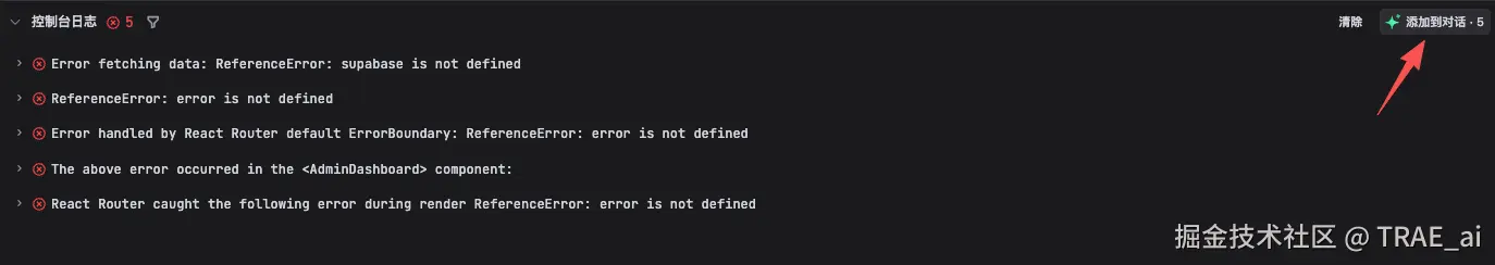 比如程序报错了,在控制台里点「添加到对话」,就可以一次性将多个报错信息告诉 TRAE,让它修复。