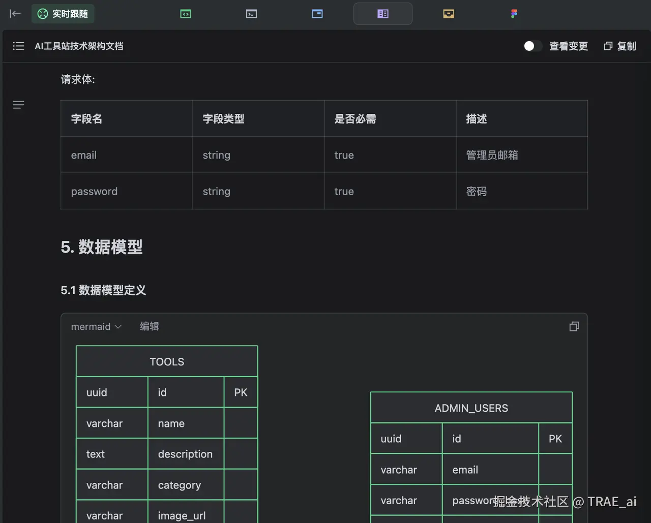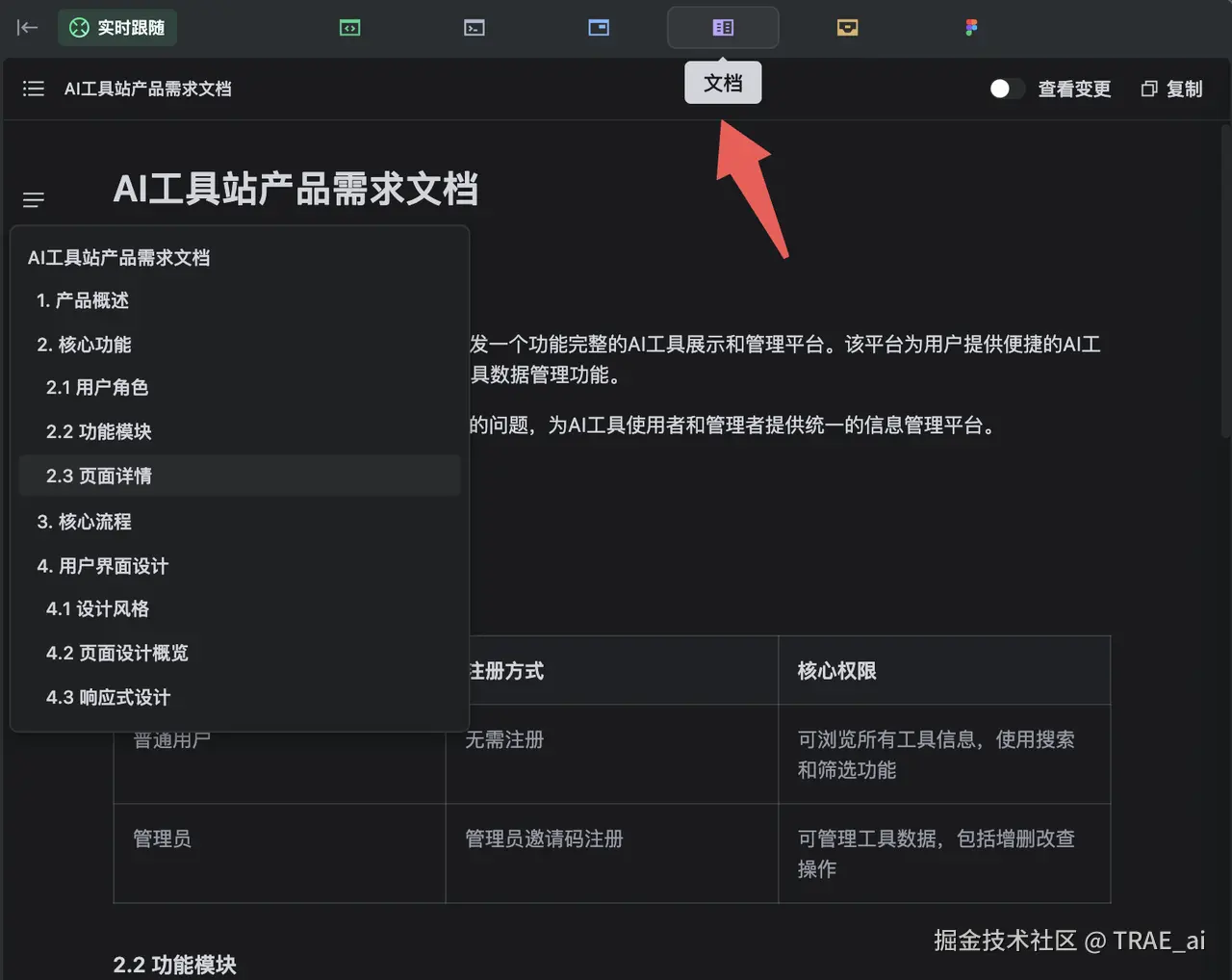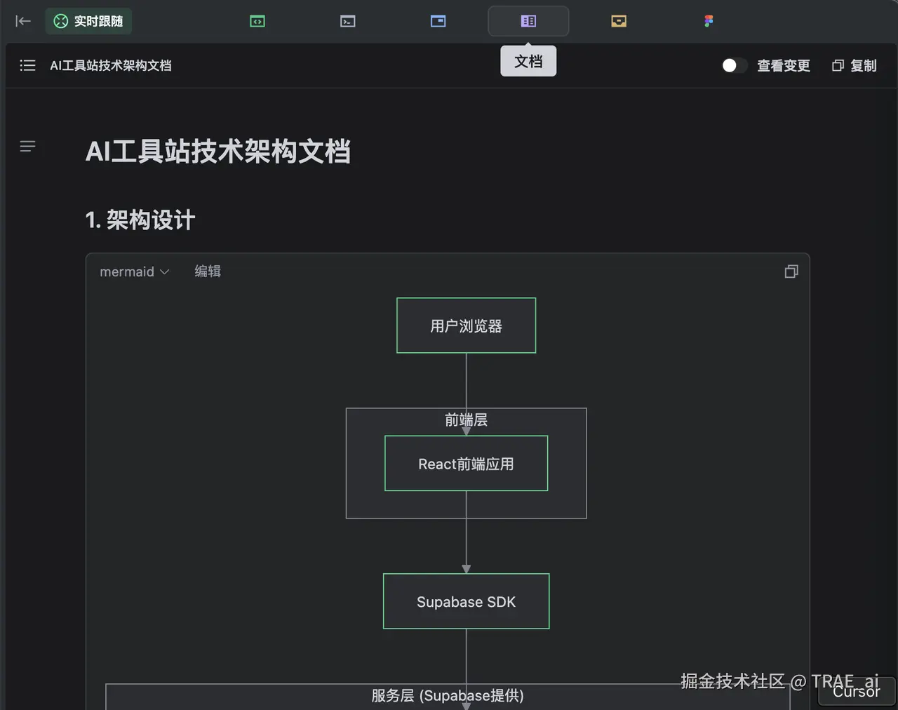 TRAE SOLO 在接到需求后,就开始干活了。它先是创建了「产品需求文档」和「技术架构文档」,用于指导后续的开发。