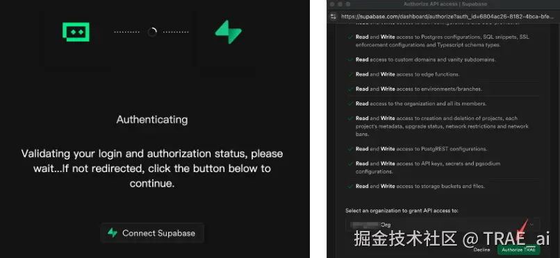 授权连接 Supabase、选择项目后,TRAE 就可以自动帮我们完成数据库建表、增删改查及用户认证等操作。