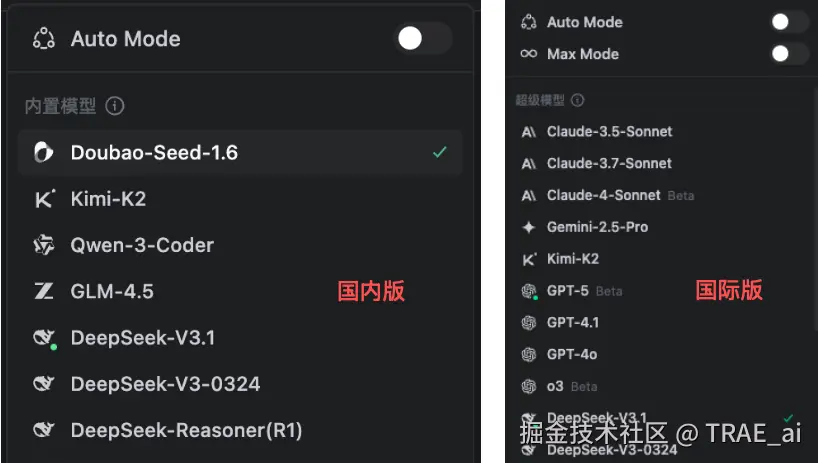 国内版的 TRAE 主要集成了豆包、Kimi、Qwen、GLM、DeepSeek 等国内主流的大模型,而国际版 TRAE 主要集成了 Claude、Gemini、GPT 等国际主流的一些大模型。