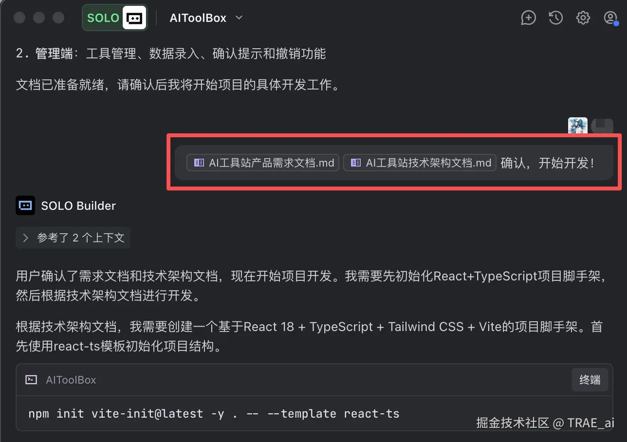TRAE 先是根据技术架构文档,创建了项目的脚手架,并自动安装了所需的依赖包。