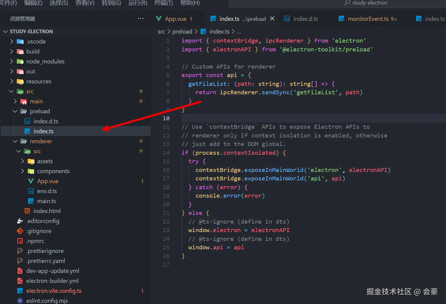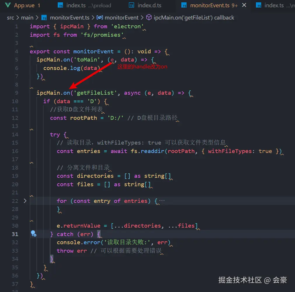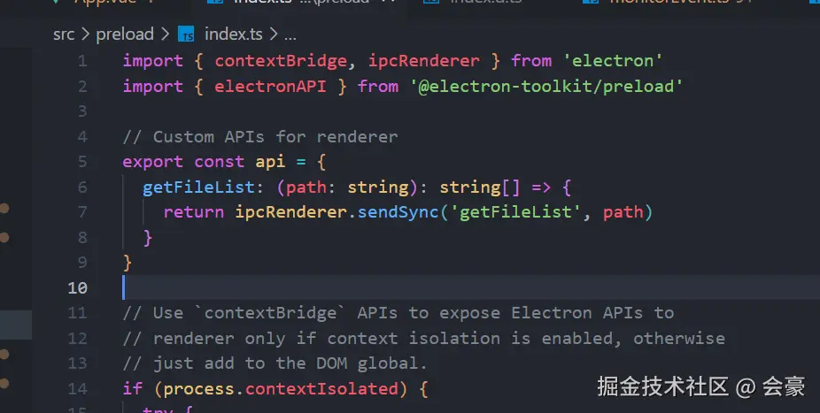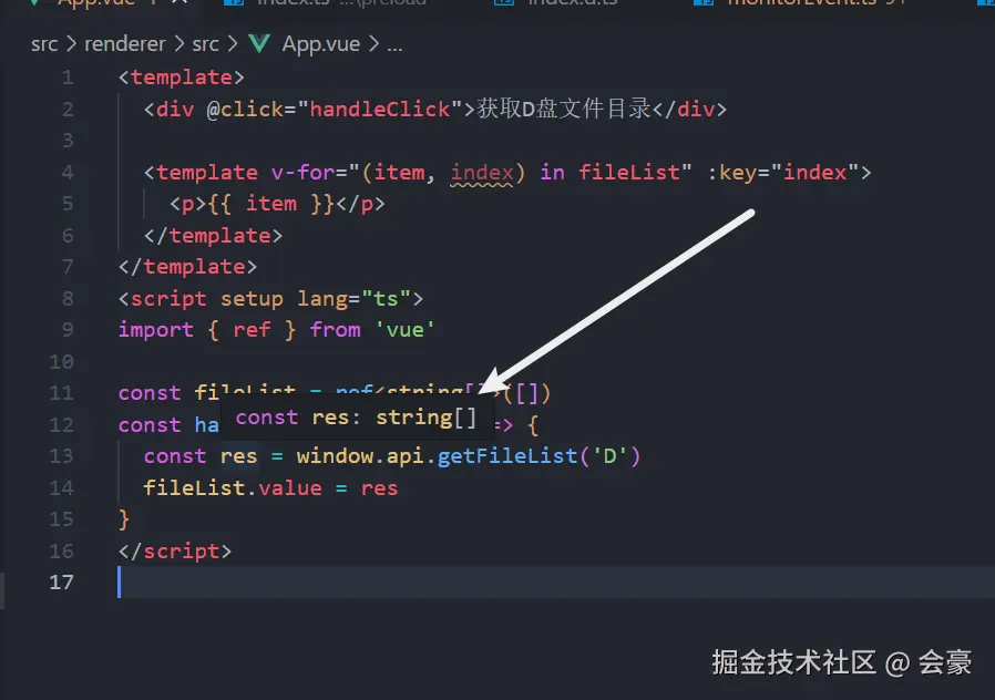 我们在预加载ts里面,写了一个方法 getFileList,然后这个方法我们也暴露了返回值的类型,那之后我们在前端接收的时候,就会被告知返回类型是什么