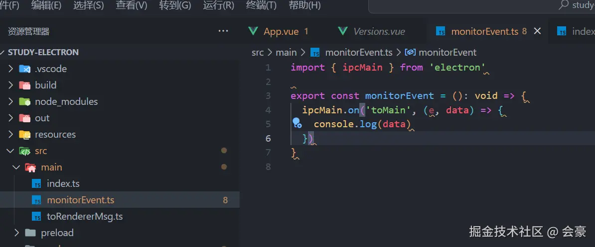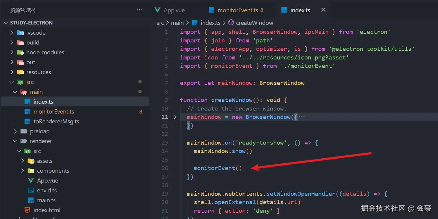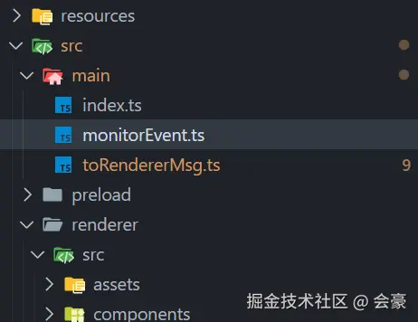 第二步:然后我们回到主进程,在主进程文件夹下面创建一个新的文件 monitorEvent.ts