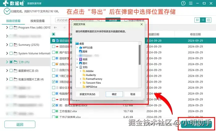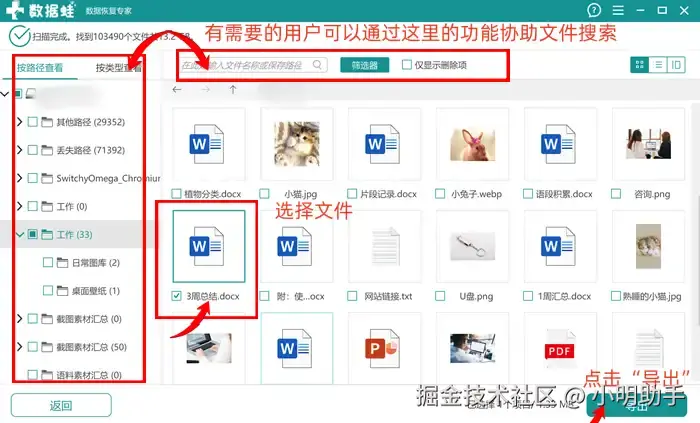 第2步: 等待软件扫描完成之后,我们就能在软件页面上勾选出自己需要恢复的文件;勾选好目标文件之后,按下“导出”按钮;