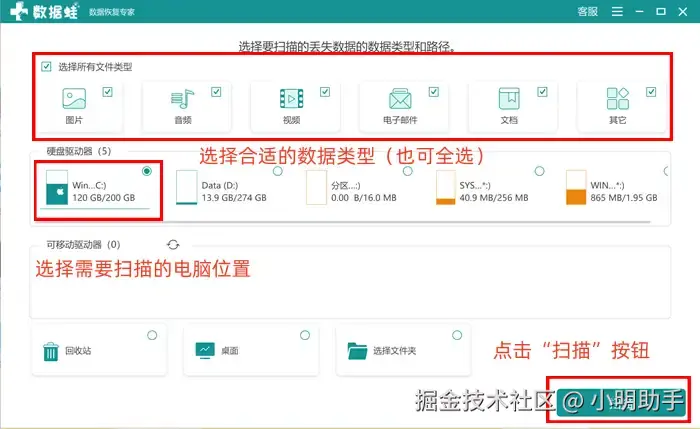 第1步: 在数据 蛙恢复专家的首页中,根据自己的需求设置好一会扫描的文件类型和电脑位置,选好之后点击“扫描”按钮;