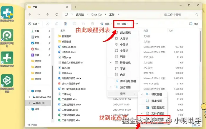 第1步: 在硬盘中的文件资源管理器中,点击“查看”后在显示列表中指着“显示”;
