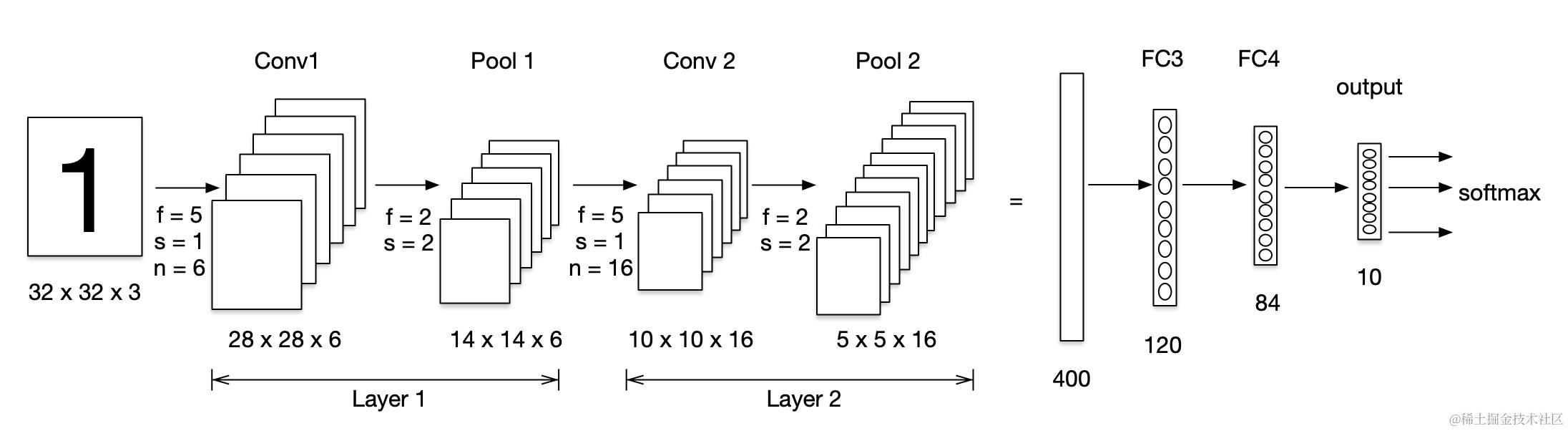 首先 从一个稍微早一些的卷积网络结构LeNet-5(这里稍微改了下名字),开始的目的是用来识别数字的。从前往后介绍完整的结构组成,并计算相关输入和输出。