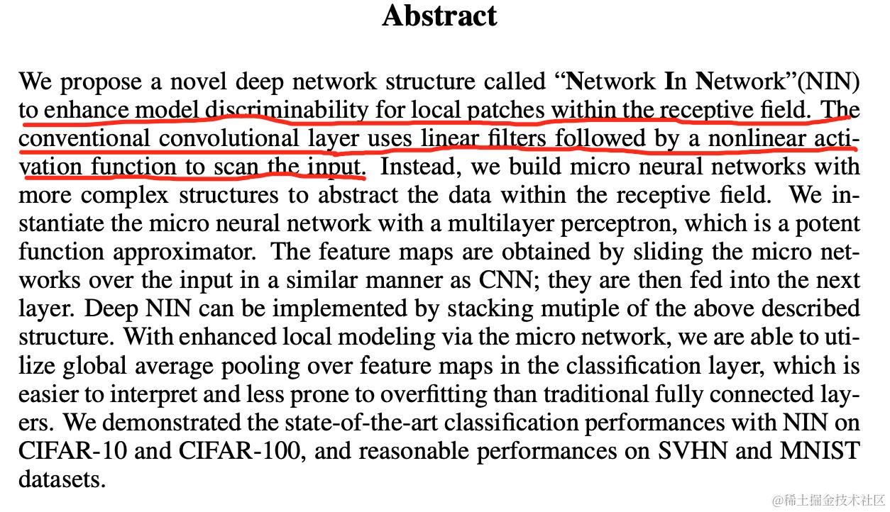 目的:提出了一种新的深度网络结构,称为“网络中的网络”(NIN),增强接受域内局部贴片的模型判别能力。