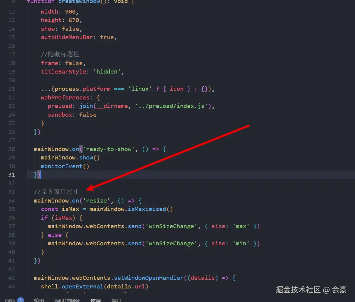 这段代码的意思是我们要开始监听mainWindow窗口的尺寸,如果窗口发生了改变,就会立即触发回调函数
