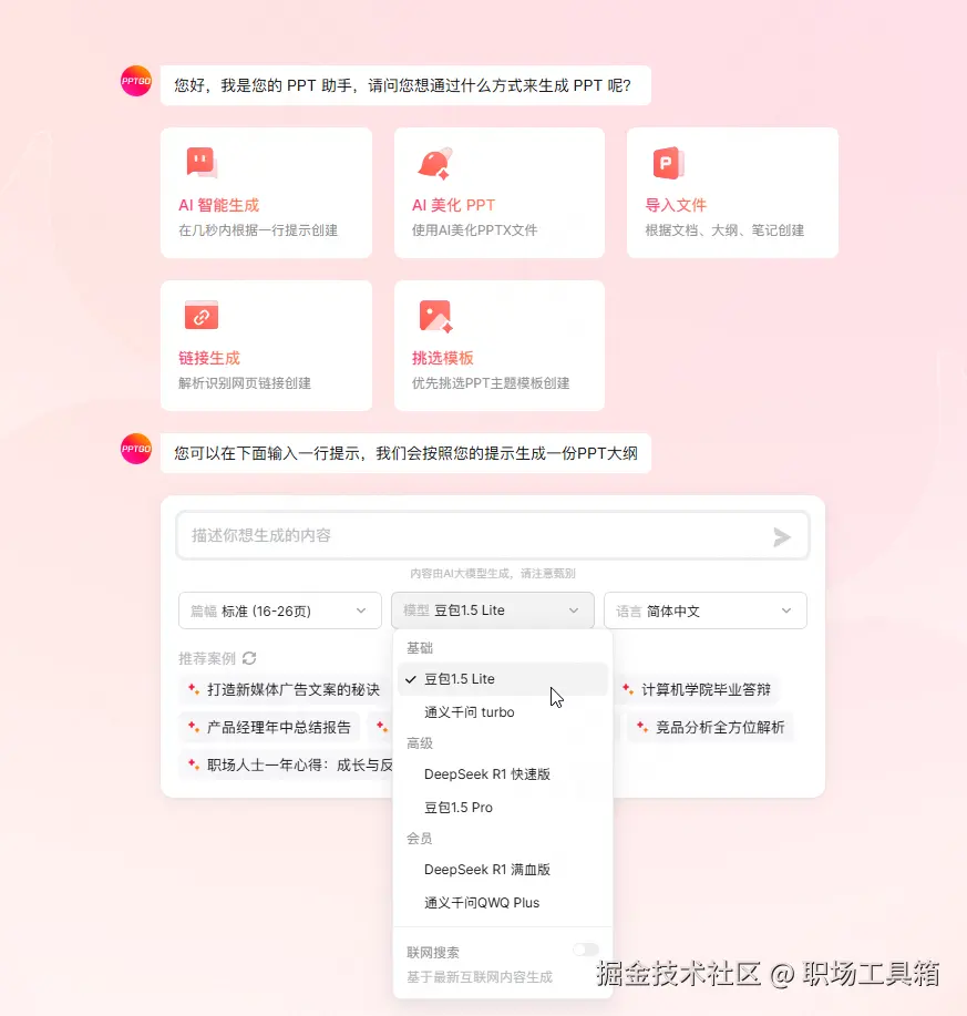 博思AIPPT中切换AI大模型:点击输入框下方的“模型”选项,如下图,在下方的弹出的浮窗,可自由切换想使用的AI大模型。