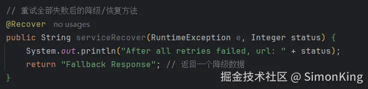 @Retryable+@Backoff+@Recover是最高效、最清晰的选择。 - 动手写代码:当你需要极致灵活和动态控制时,
