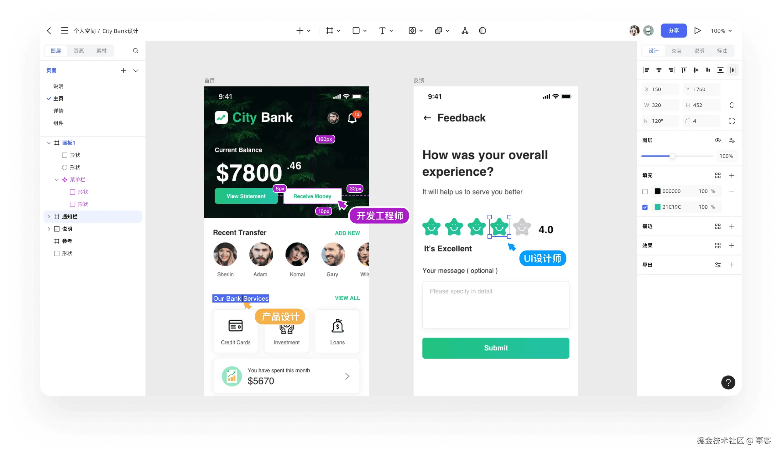 **推荐理由:**Figma功能强大,协作性出色,还有庞大的社区交流学习,是一款非常优秀的UI设计工具。有点小遗憾的是,它的服务器在国外,对国内用户有网络访问等限制,因此给到四星半。