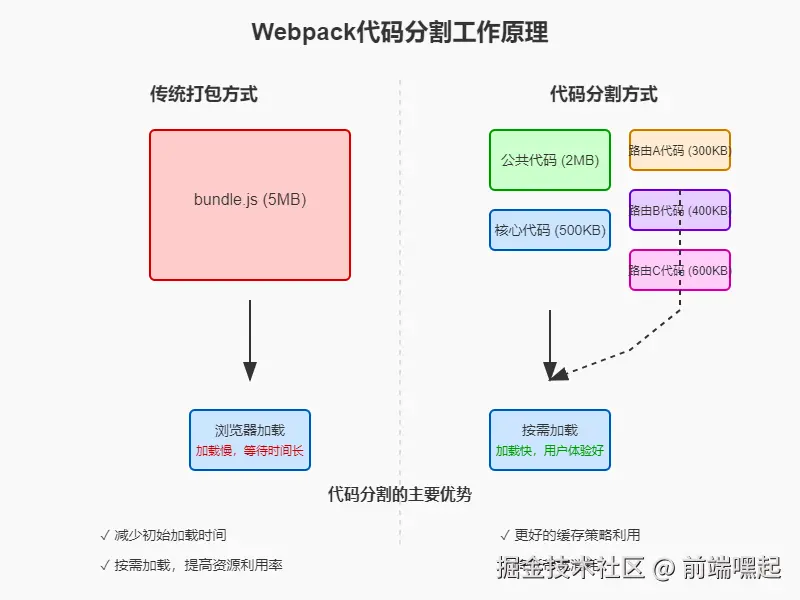 另一个重要的好处是缓存优化。如果我们不进行代码分割,每次修改任何一处代码,用户都需要重新下载整个包。而通过代码分割,我们可以将第三方库和框架代码与业务代码分开打包。由于第三方库和框架的代码相对稳定,用户只需要下载一次,之后就可以从缓存中读取。只有当我们修改了业务代码时,用户才需要下载新的业务代码块。