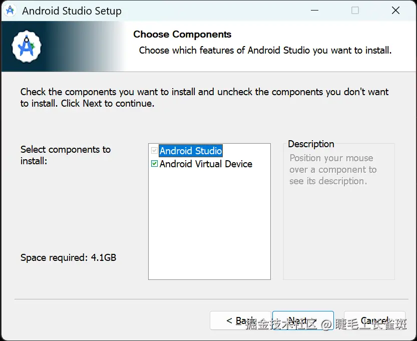 选择组件:建议勾选所有默认组件,尤其是 “Android Virtual Device” (Android 虚拟设备),以便后续创建模拟器。点击 “Next”。