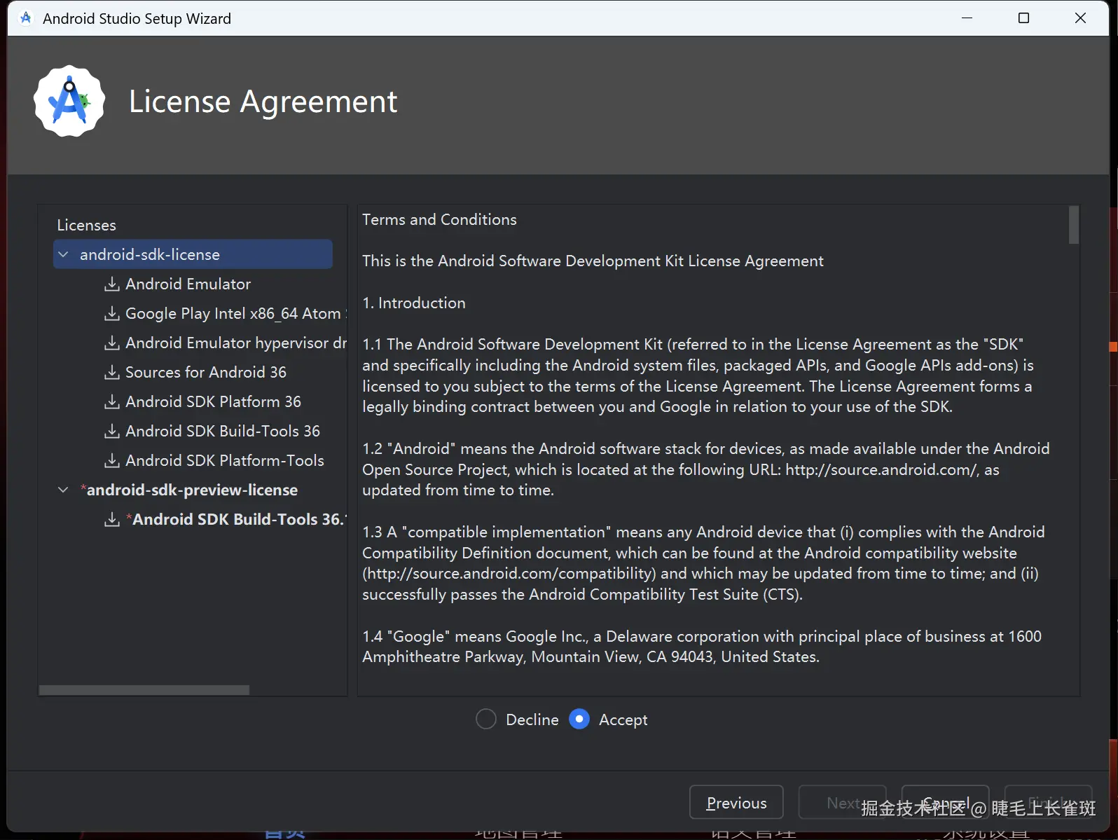 下载 SDK 组件:点击 “Finish” 后,IDE 将开始下载 Android SDK 和其他必要的构建工具。此过程需要联网,且耗时较长(具体取决于你的网络速度),请耐心等待。