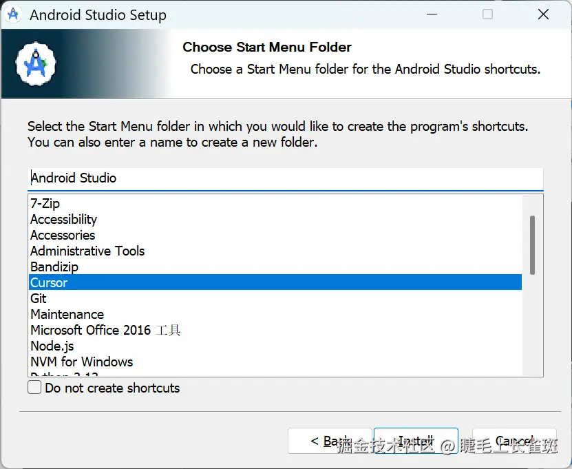 选择开始菜单文件夹:保持默认即可,或者直接把/前面的文件夹删掉,点击 “Install”。