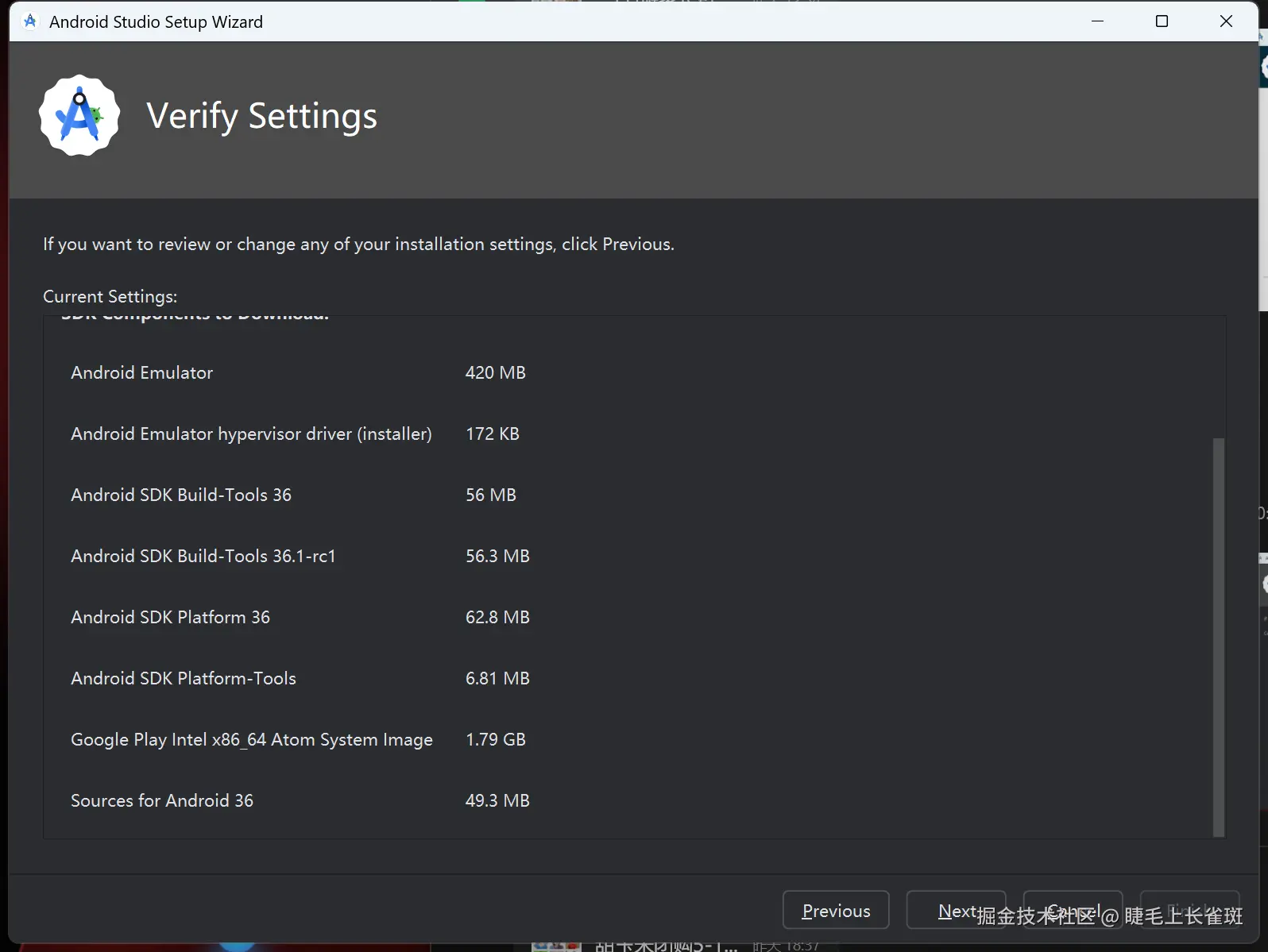 验证设置:确认即将下载的 SDK 组件列表,点击 “Next”。