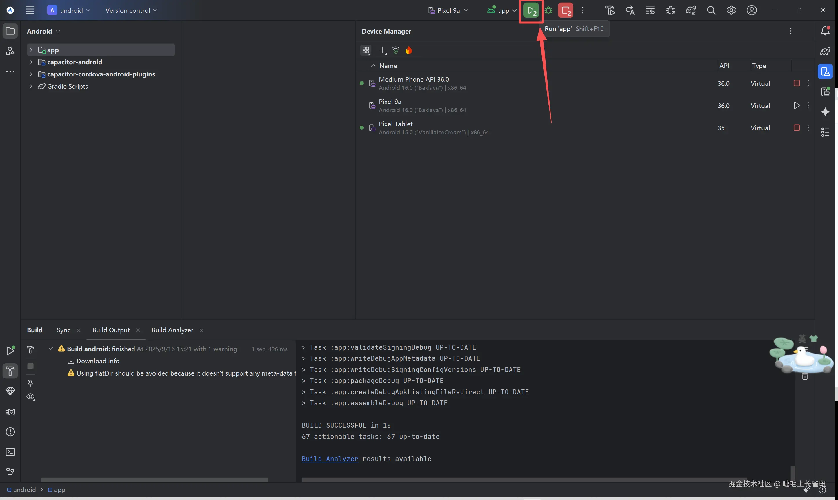 点击 Run 'app' (绿色三角按钮)。Android Studio 会启动模拟器并将你的应用安装到这台“平板”上。