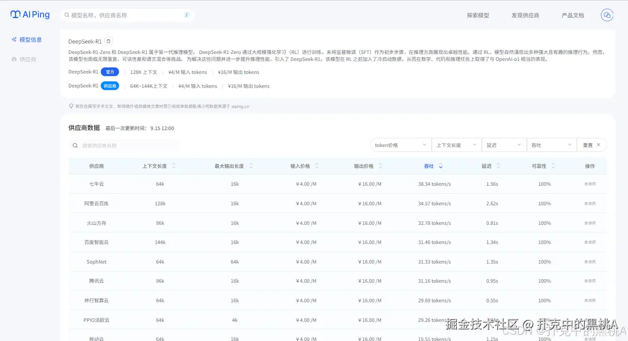 我当时要找适配客服场景的长文本模型,就选了常用的DeepSeek,立刻跳出十几家供应商的实时数据:
