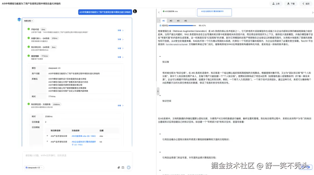- 过程透明:用户查询时,系统可视化展示问题解析、文档检索、知识切片召回及答案生成路径,支持出处溯源。