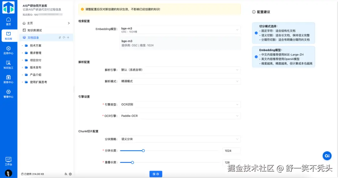 - 可配置调试:业务人员无需编码,通过界面查看解析效果(如切片边界),调整检索策略(如混合BM25和ANN算法),提升问答质量。