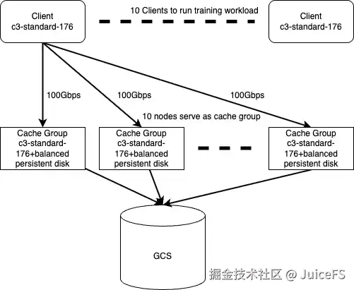📝 需要说明的是,本次测试在 GCP 上选用的机型中,单个可用区能稳定开启的弹性实例数量有限,因此我们提交的测试最大规模为 10 节点。这并不代表 JuiceFS 系统的最大承载能力,系统在更大规模节点下仍可提供更高的聚合带宽和训练规模。