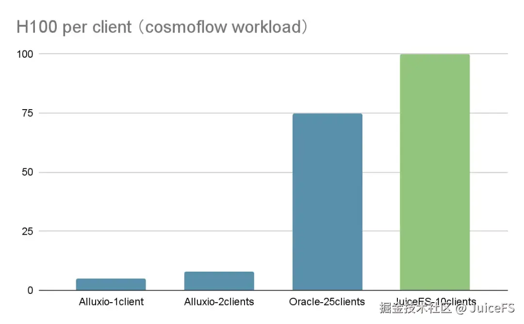 下图横轴表示系统能够支撑的 GPU 总数,即 H100 GPU 的数量,JuiceFS 的表现继续领先。通过 10 个客户端同时运行,成功支撑了 100 张 H100 GPU 的 Cosmoflow 训练任务,GPU 利用率保持在规定阈值以上。