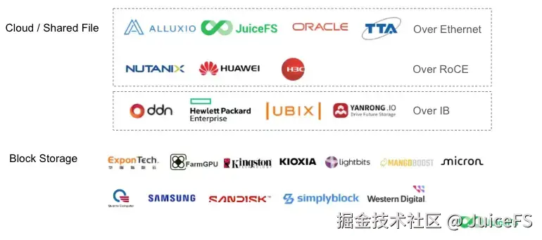 第一类是基于以太网的系统,包括 Alluxio、JuiceFS 和 Oracle,这些云上系统依赖以太网环境提供分布式存储能力,从而实现高性能存储。另有一些厂商,如 Nutanix 和华为,则采用了基于 RoCE 的以太网方案,单机通常配置更高带宽的网卡。