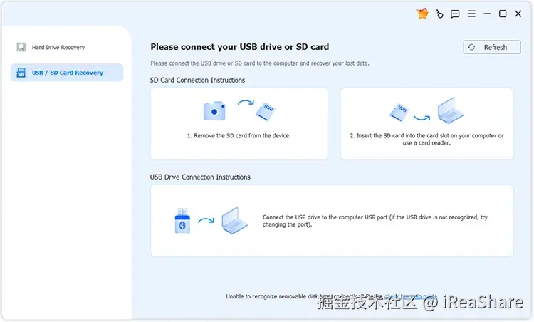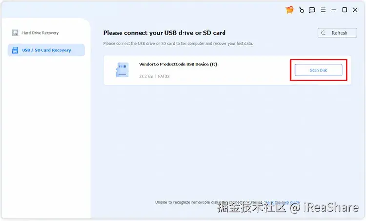 步骤 2: 点击“刷新”,然后点击连接的 USB 驱动器或 SD 卡旁边的“扫描磁盘”。